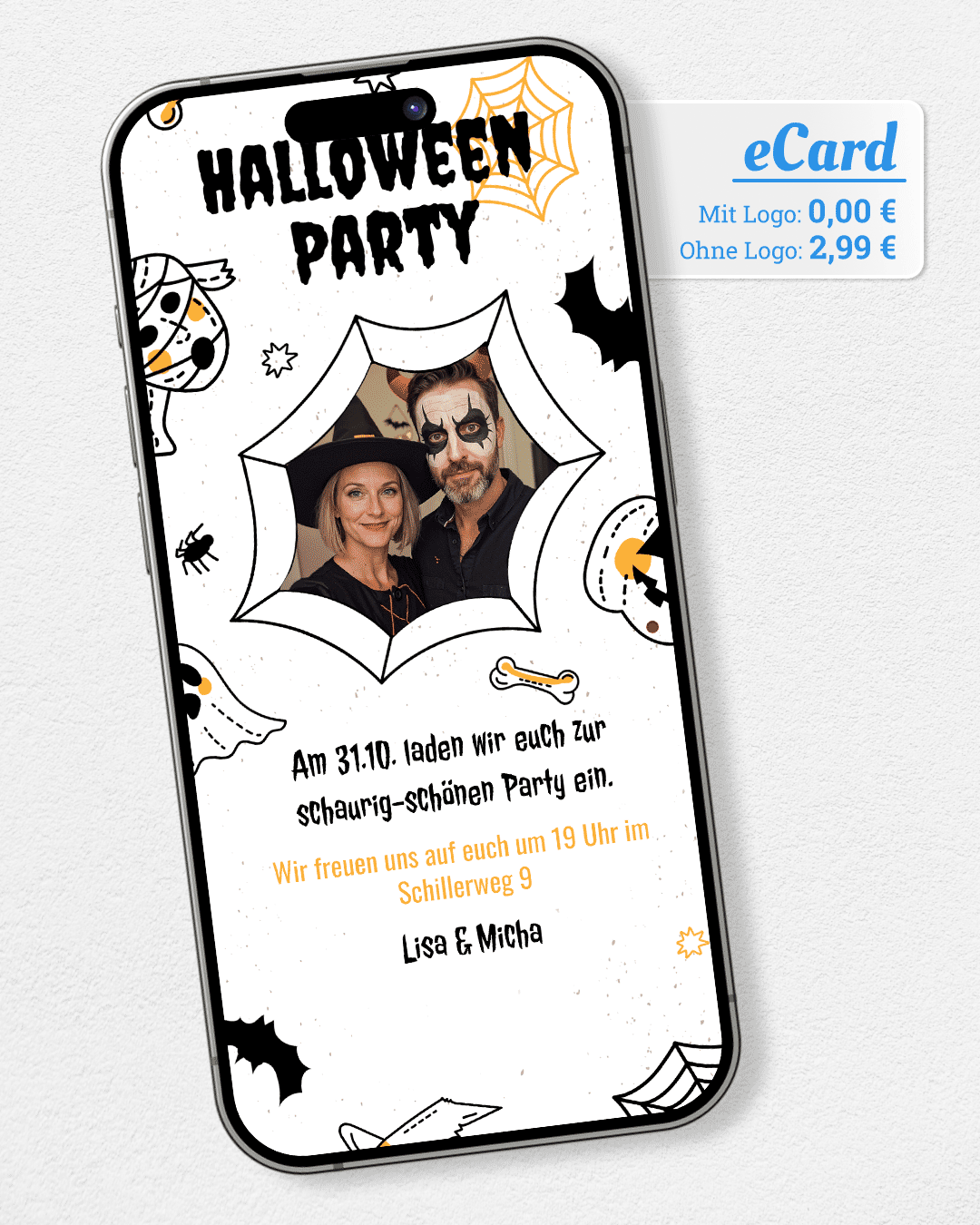 Halloween Einladung Spinne mit Foto weiss