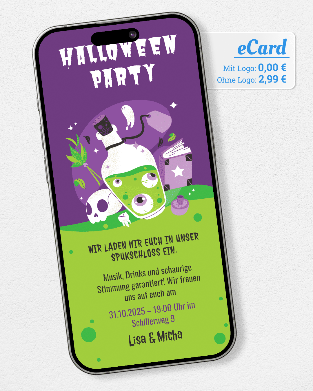 Versende gruselige Halloween-Partyeinladungen oder -Grüße per WhatsApp. Vorlage wählen, Text ergänzen und mit einem Klick versenden. Jetzt kostenlos ausprobieren!