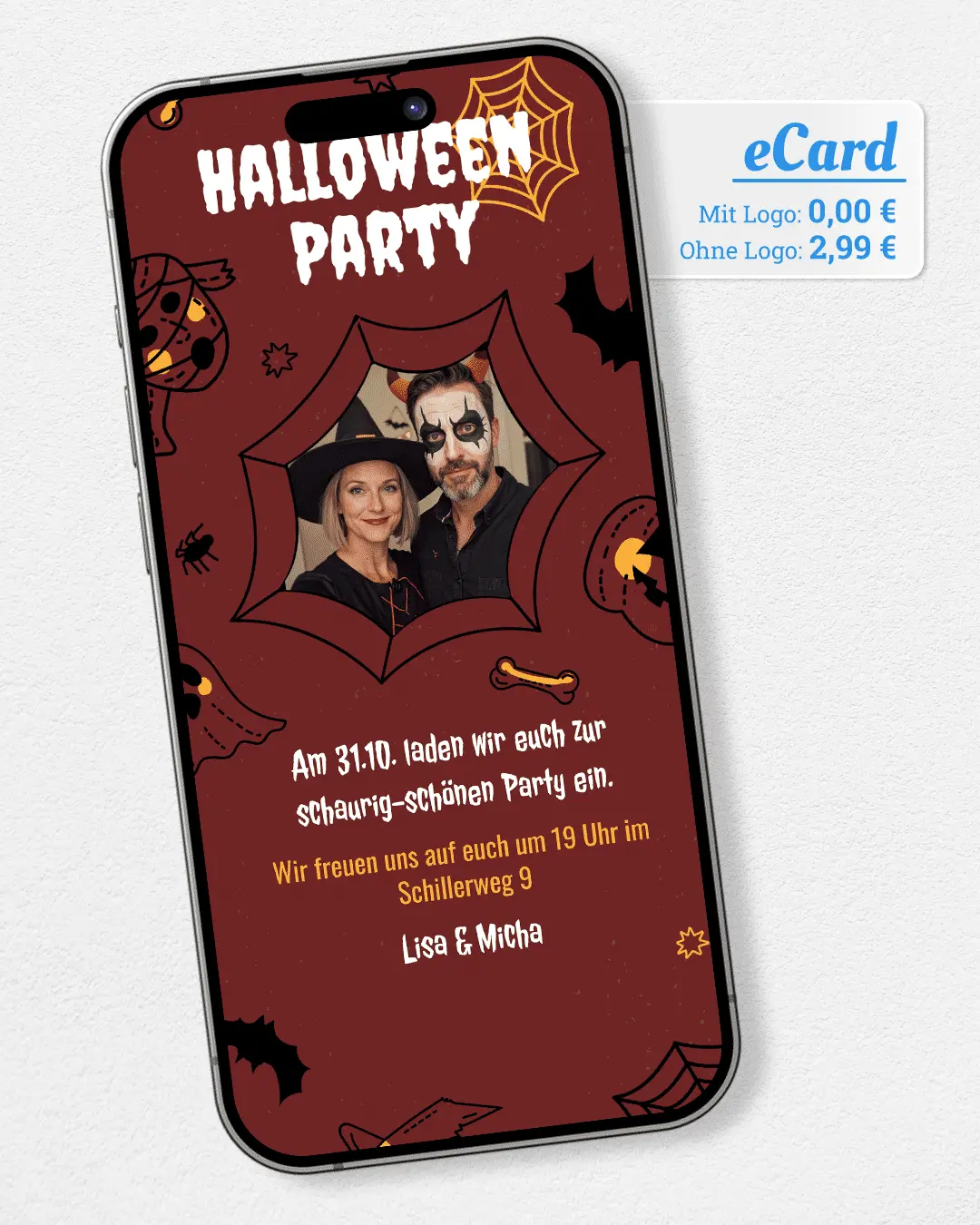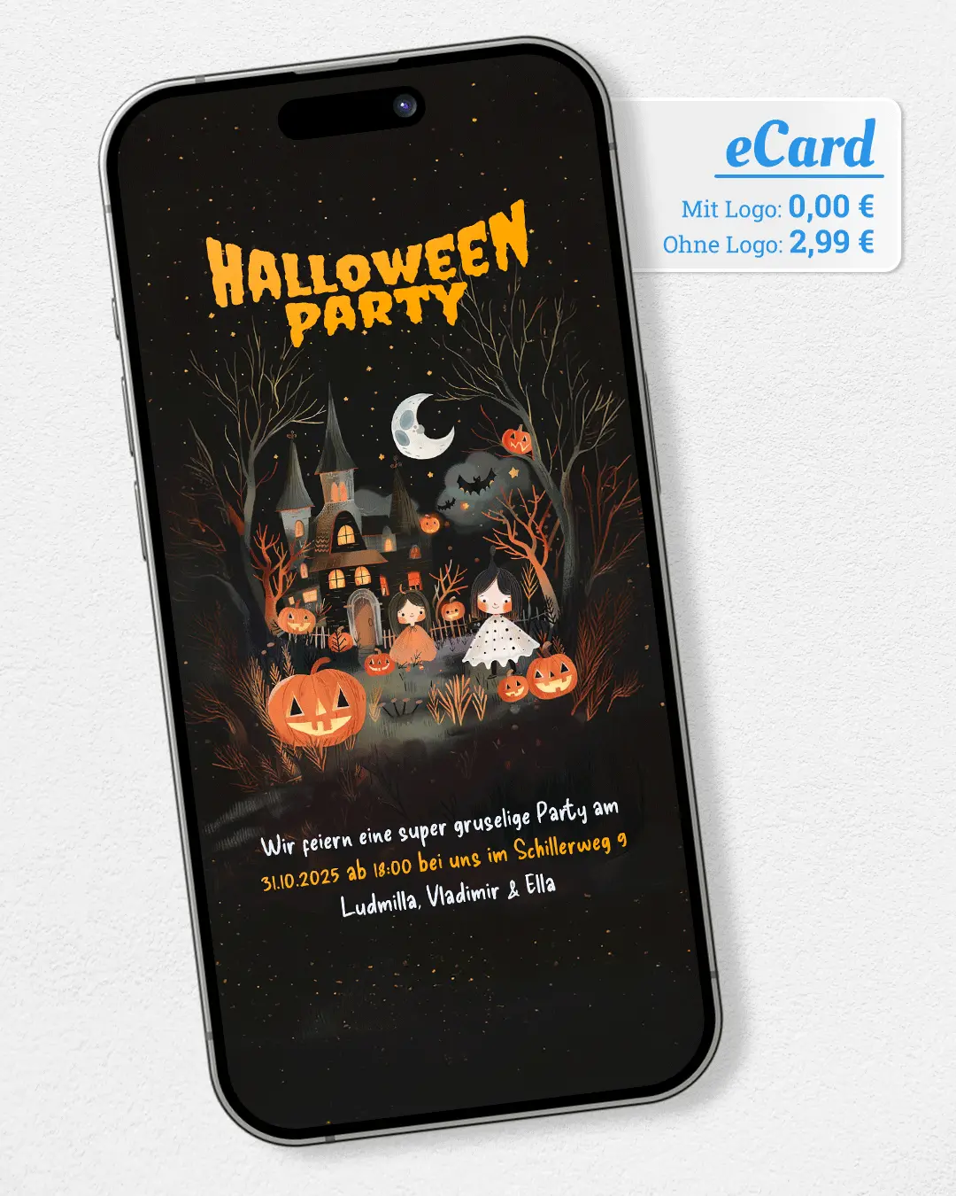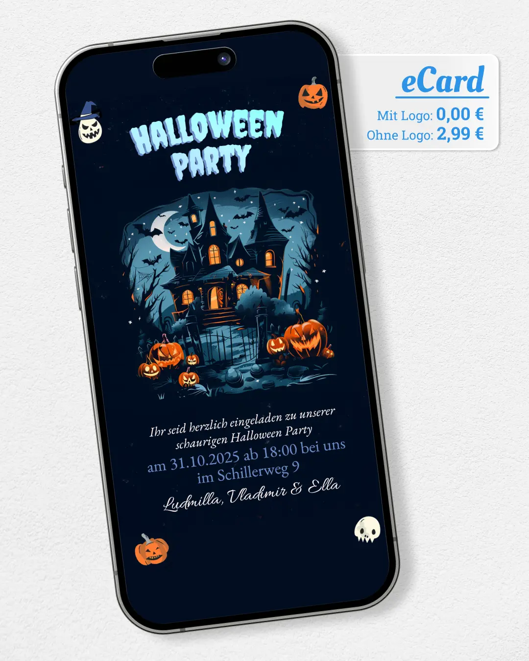 Versende gruselige Halloween-Partyeinladungen oder -Grüße per WhatsApp. Vorlage wählen, Text ergänzen und mit einem Klick versenden. Jetzt kostenlos ausprobieren!
