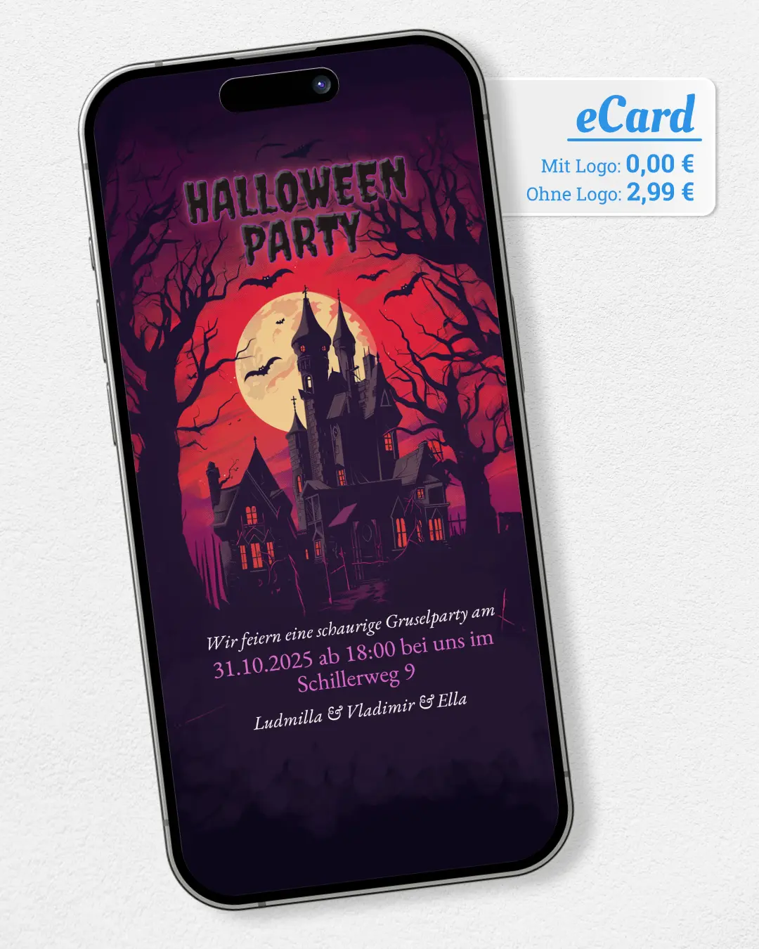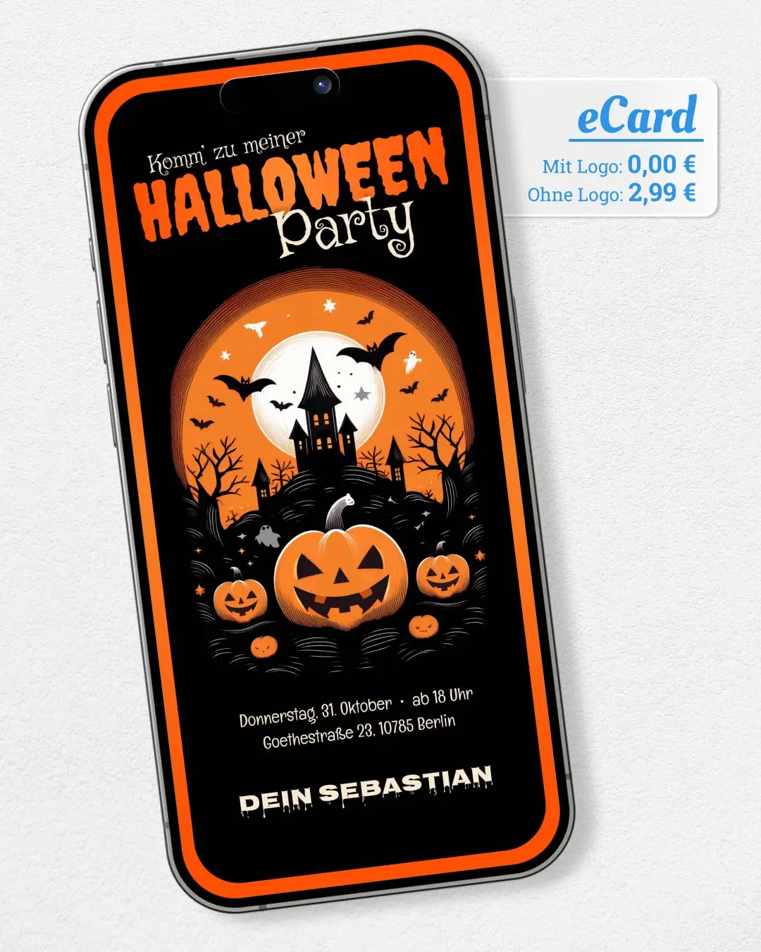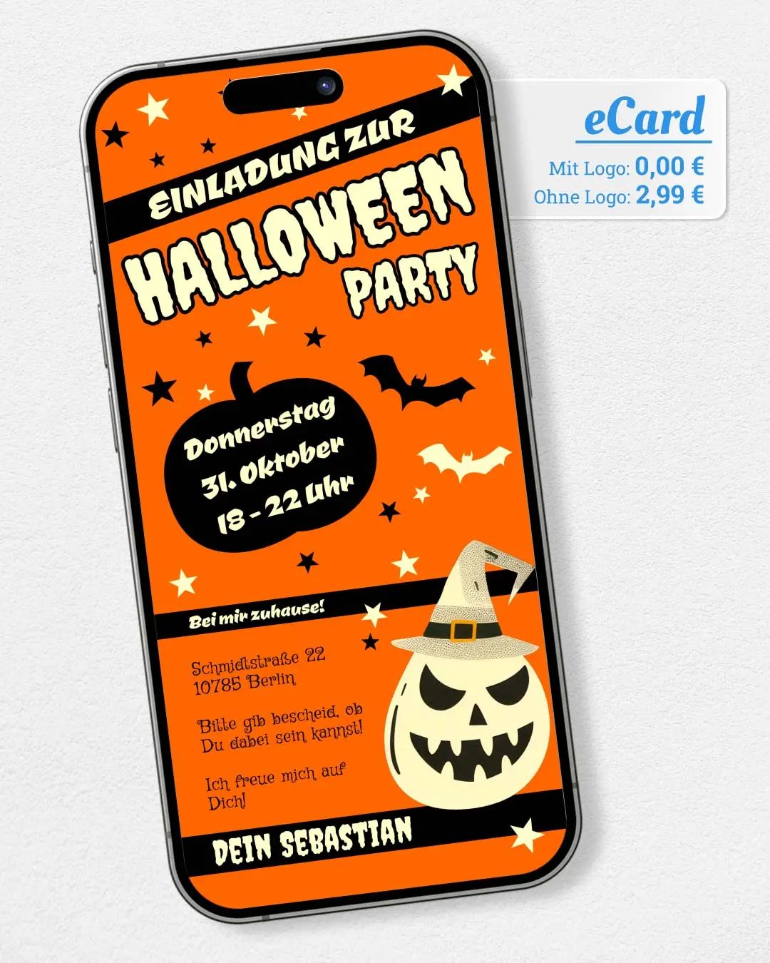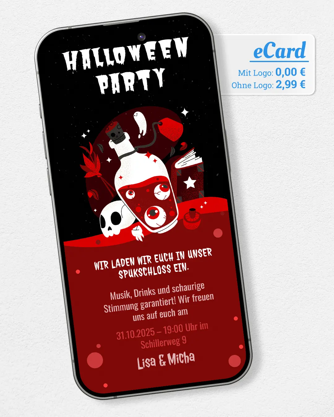 Versende gruselige Halloween-Partyeinladungen oder -Grüße per WhatsApp. Vorlage wählen, Text ergänzen und mit einem Klick versenden. Jetzt kostenlos ausprobieren!