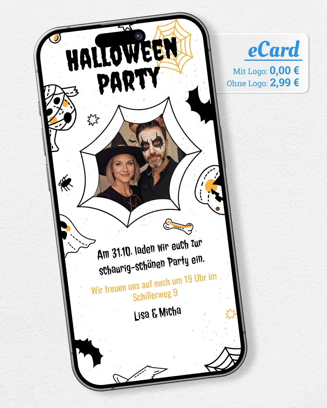 Halloween Einladung Spinne mit Foto weiss