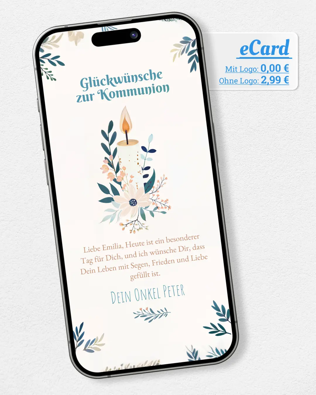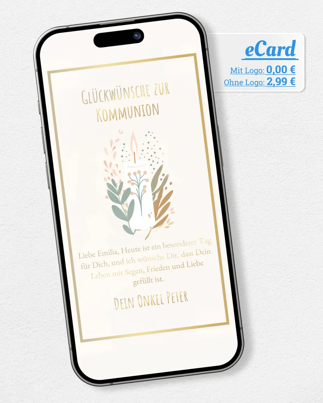 Versende Einladungen und Glückwünsche zur Kommunion als digitale eCard per WhatsApp. Einfach Vorlage auswählen, Text und Foto ergänzen und ab dafür!